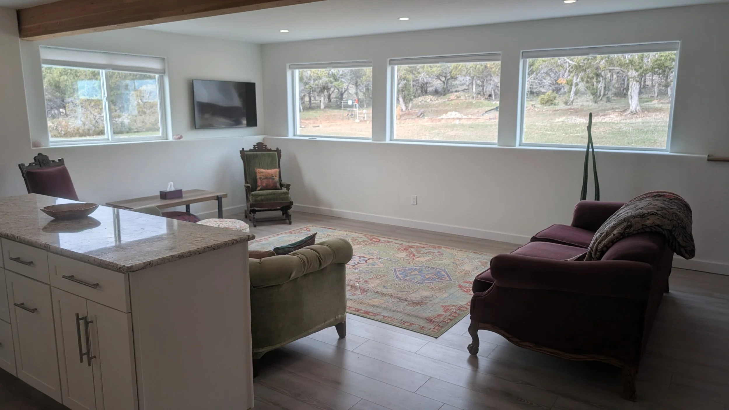 This 2500 square foot chalet is where the indoor part of our retreat will be held. The kitchen and bathrooms are available for everyone to use.. The 600 sq. ft. deck is ours to soak in stunning panoramic views of the West Elk Mountain Range and the town of Paonia.